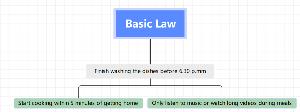 For example, if I want to reduce the time spent dealing with hunger, and my Basic Law states: “Must finish washing dishes by 6:30 PM,” then my cooking and eating-related behavioral chains can fall under this Basic Law.